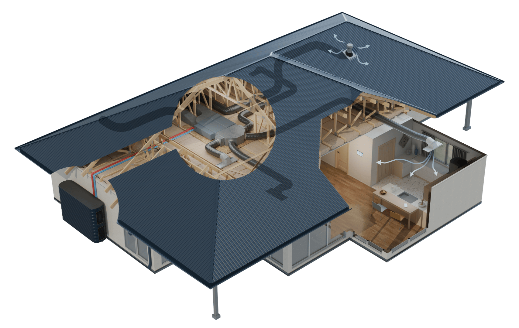 Thermi provdes ducted reverse cycle air-conditioning (RCAC) heating and cooling throughout the home, using standard vents and ductwork. Ducting can be run through the roof cavity, or for high star rating & PassivHaus builds, through typical HRV ductwork inside the building envelope.
